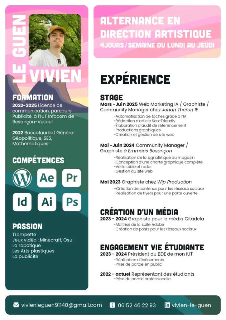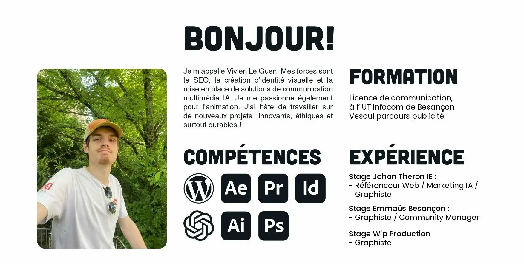 Je m’appelle Vivien, et je travaille dans le domaine de la direction artistique. Sur mon site, vous trouverez du motion design, du graphisme, du SEO et de l’IA.